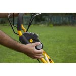 Verwahren und Aufstellen des Mähers zu Arbeitsbeginn war noch nie so einfach! Mit einer einfachen Drehbewegung kann der Griff zusammengeklappt und platzsparend verstaut werden.